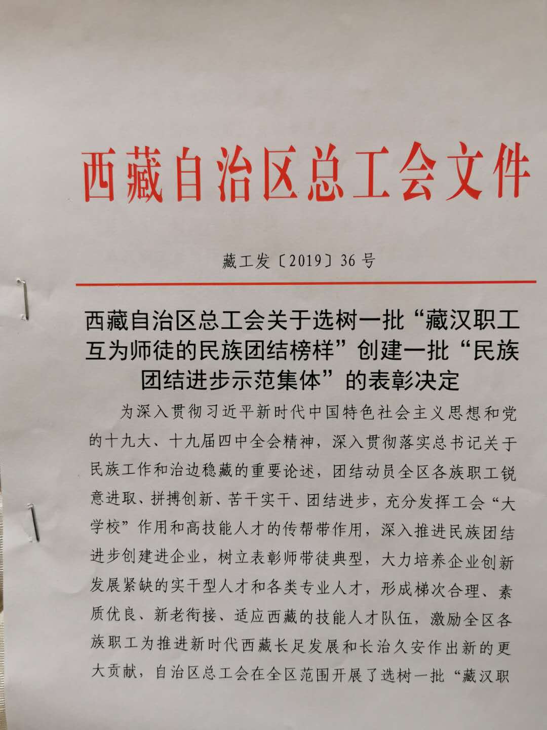 西藏自治區(qū)總工會關(guān)于選樹一批 "藏漢職工互為師徒的民族團結(jié)榜樣 "創(chuàng)建一批 "民族團結(jié)進(jìn)步示范集體 "的表彰決定