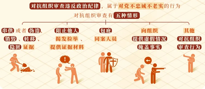 《中國共產(chǎn)黨紀(jì)律處分條例》第六十三條規(guī)定了對抗組織審查,應(yīng)予處分的五種情形:串供或者偽造、銷毀、轉(zhuǎn)移、隱匿證據(jù);阻止他人揭發(fā)檢舉、提供證據(jù)材料;包庇同案人員;向組織提供虛假情況,掩蓋事實;其他對抗組織審查行為。