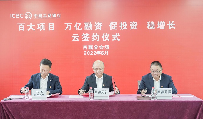 為深入貫徹黨中央“疫情要防住、經(jīng)濟要穩(wěn)住、發(fā)展要安全”重要決策部署,提升助力經(jīng)濟穩(wěn)增長服務(wù)水平,6月9日下午,中國工商銀行總行舉行了“百大項目 萬億融資 促投資 穩(wěn)增長”云簽約儀式。西藏開發(fā)投資集團有限公司作為西藏自治區(qū)簽約重點客戶之一,在中國工商銀行西藏分會場簽訂清潔能源項目在“十四五”期間提供不超過100億元等值人民幣意向性融資額度合作協(xié)議。