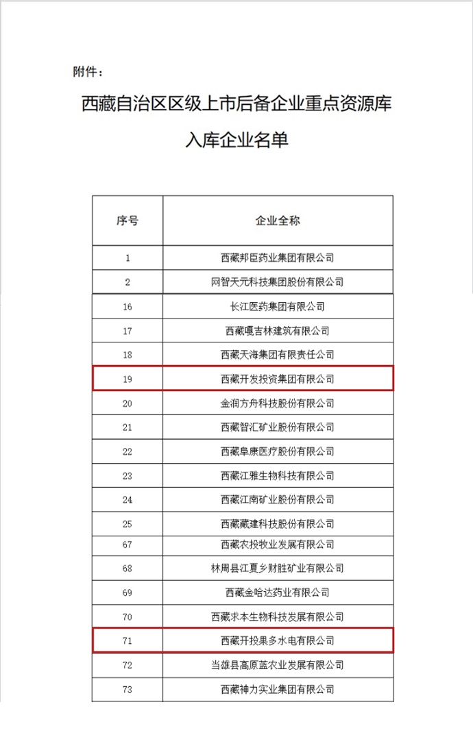 西藏開發(fā)投資集團(tuán)和西藏開投果多水電成功入選上市后備企業(yè)資源庫