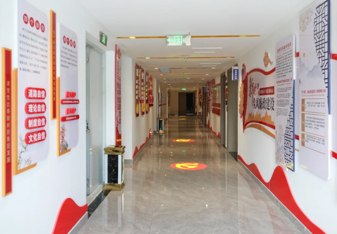 集團(tuán)黨建活動陣地位于集團(tuán)辦公樓11樓,占地180㎡,分為黨建文化長廊、黨員活動室、支部會議室三個(gè)功能區(qū),集黨員學(xué)習(xí)教育、組織生活開展、黨建成果展示等功能于一體。其中,黨建文化長廊由黨建引領(lǐng)發(fā)展、傳承紅色精神、筑牢戰(zhàn)斗堡壘、挺膺擔(dān)當(dāng)奮進(jìn)、構(gòu)建精神文明、建設(shè)廉政文化六個(gè)部分組成,圖文并茂的形式讓每一位走過長廊的黨員都能深刻領(lǐng)悟黨建工作的深刻內(nèi)涵。黨員活動室包含了組織架構(gòu)展示、榮譽(yù)展示、黨建工作展示、學(xué)習(xí)區(qū)等內(nèi)容,配備桌椅茶幾等休閑設(shè)施,布置溫馨,氛圍濃厚。