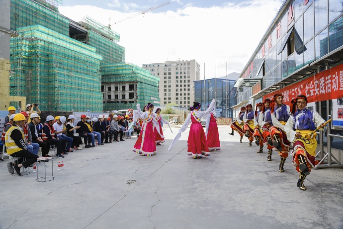 在能源基地項(xiàng)目現(xiàn)場,青春洋溢的大學(xué)生隊(duì)員們以特色舞蹈展現(xiàn)了西藏地方文化。西藏大學(xué)帶隊(duì)老師向工人代表贈送了應(yīng)急處置知識包,并向參建工人普及日常應(yīng)急知識。隨后,師生們在集團(tuán)公司安全監(jiān)管人員的帶領(lǐng)下,參觀了能源基地項(xiàng)目。