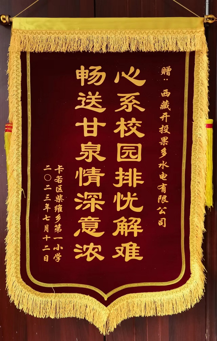 捐贈現(xiàn)場,果多水電公司董事長、總經(jīng)理宋亞東與校長李松林親切交流,了解孩子們學(xué)習(xí)、生活情況,鼓勵(lì)孩子們要好好學(xué)習(xí),保持樂觀向上的心態(tài),健康快樂成長。作為受助方,李松林向果多水電公司贈送“心系校園排憂解難 暢送甘泉情深意濃”錦旗以表謝意。他表示,愛心無價(jià),情誼永恒,全校師生將把這份關(guān)愛化作砥礪前行的動(dòng)力,努力提高柴維鄉(xiāng)教育教學(xué)質(zhì)量,培養(yǎng)出德、智、體、美、勞全面發(fā)展的新時(shí)代好少年。