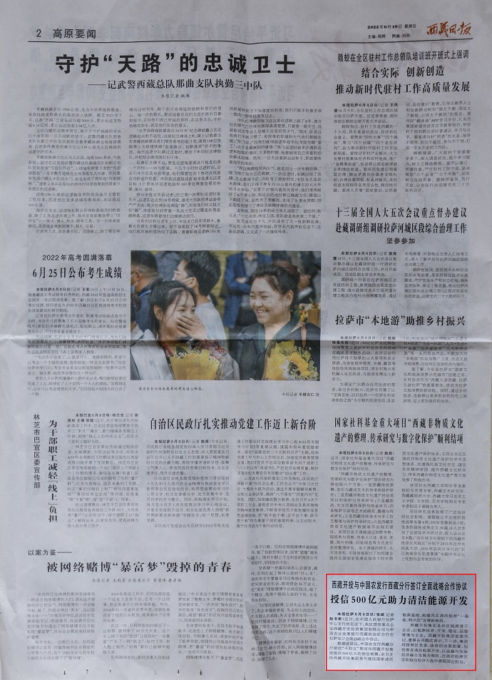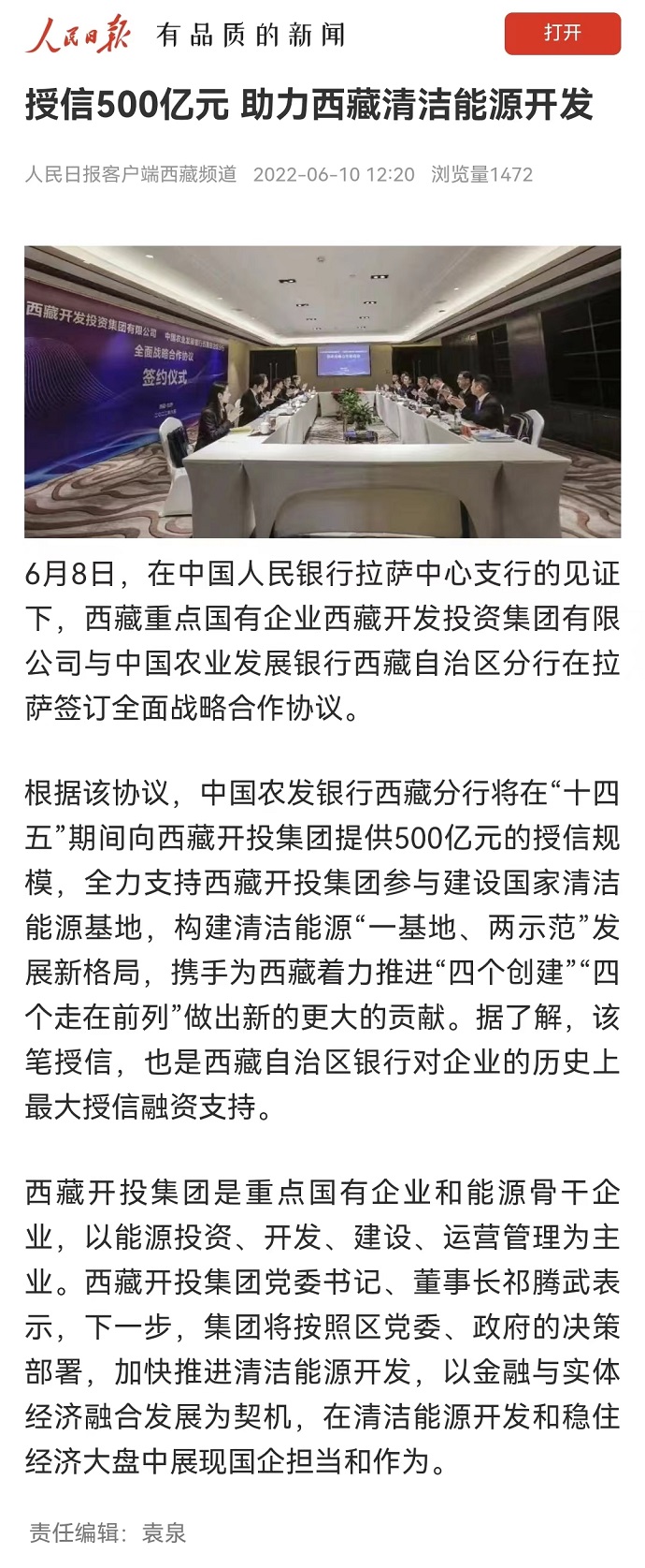 ?。ň幷甙矗?月10日,《人民日報》客戶端西藏頻道報道了《授信500億元 助力西藏清潔能源開發(fā)》。《西藏日報》2022年6月10日在第2版“高原要聞”欄目刊登文章,報道《授信500億元|西藏開投集團與中國農發(fā)行西藏分行簽訂全面戰(zhàn)略合作協(xié)議》。西藏電視臺2022年6月10日在西藏電視臺影視文化頻道《今晚九點》欄目報道了《授信500億元|西藏開投集團與中國農發(fā)行西藏分行簽訂全面戰(zhàn)略合作協(xié)議》,《珠峰云》平臺同步播放。新華網、經濟日報、西藏衛(wèi)視、西藏日報客戶端、網信西藏、今日頭條等媒體均報道了相關新聞。全文如下: