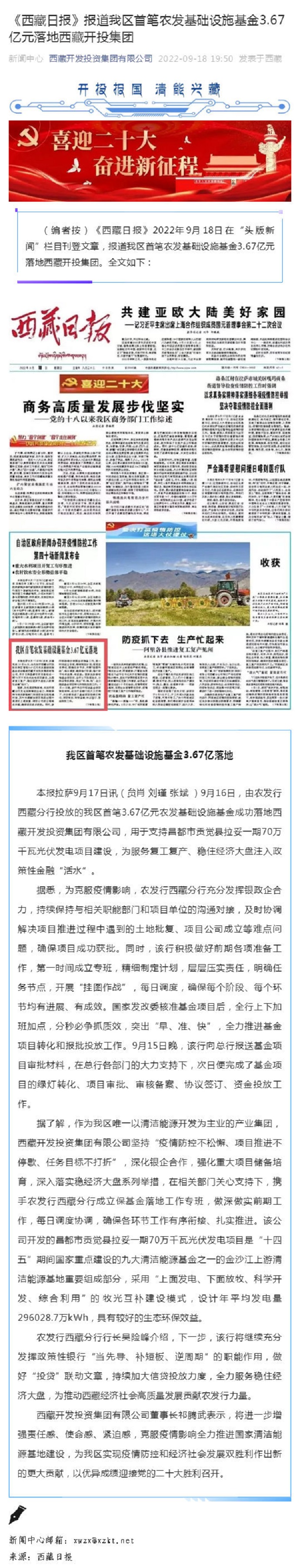 《西藏日?qǐng)?bào)》報(bào)道我區(qū)首筆農(nóng)發(fā)基礎(chǔ)設(shè)施基金3.67億元落地西藏開(kāi)投集團(tuán)