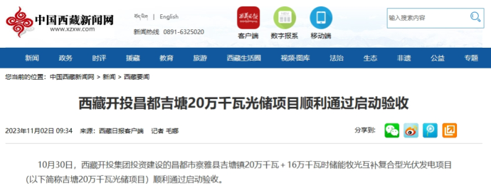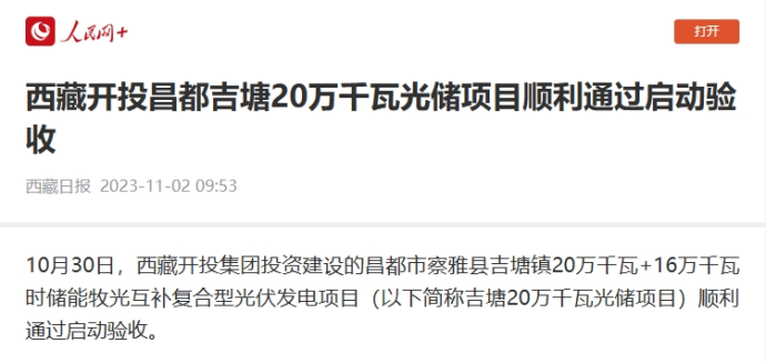編者按:11月1-2日,人民網(wǎng)、中國(guó)西藏新聞網(wǎng)、西藏日?qǐng)?bào)客戶(hù)端報(bào)道了《西藏開(kāi)投昌都吉塘20萬(wàn)千瓦光儲(chǔ)項(xiàng)目順利通過(guò)啟動(dòng)驗(yàn)收》。全文如下: