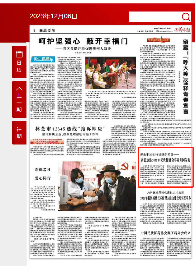 編者按:12月5日,西藏日報第二版高原要聞欄目報道了《那曲市2023年度保供項目—索縣熱熱50MW光伏儲能全容量并網(wǎng)發(fā)電》文章。全文如下: