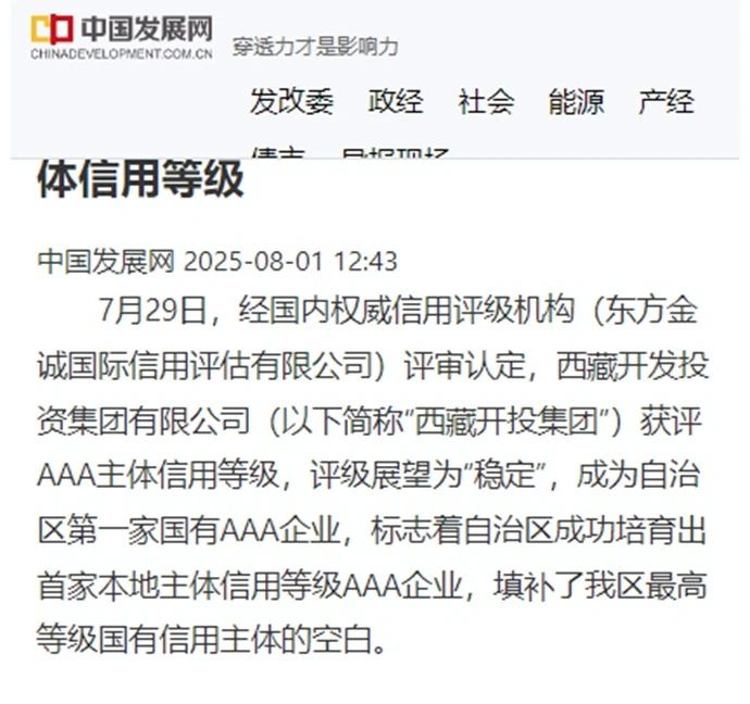 近期,中國發(fā)展網(wǎng)、西藏日報(bào)客戶端、西藏商報(bào)等媒體聚焦報(bào)道西藏開發(fā)投資集團(tuán)有限公司獲評AAA主體信用等級消息。7月29日,經(jīng)國內(nèi)權(quán)威信用評級機(jī)構(gòu)(東方金誠國際信用評估有限公司)評審認(rèn)定,西藏開發(fā)投資集團(tuán)有限公司獲評AAA主體信用等級,評級展望為“穩(wěn)定”,成為自治區(qū)第一家國有AAA企業(yè),標(biāo)志著自治區(qū)成功培育出首家本地主體信用等級AAA企業(yè),填補(bǔ)了我區(qū)最高等級國有信用主體的空白。