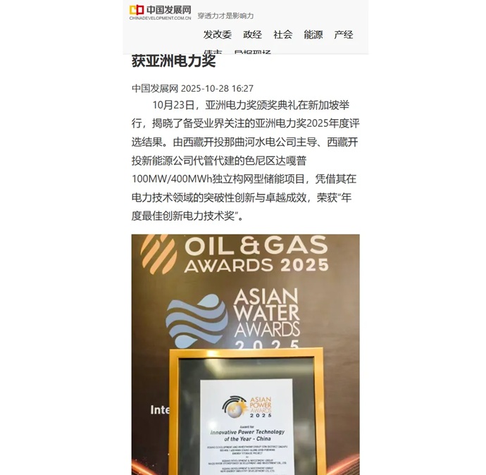 媒體報道丨色尼區(qū)達嘎普獨立構(gòu)網(wǎng)型儲能項目榮獲亞洲電力獎
