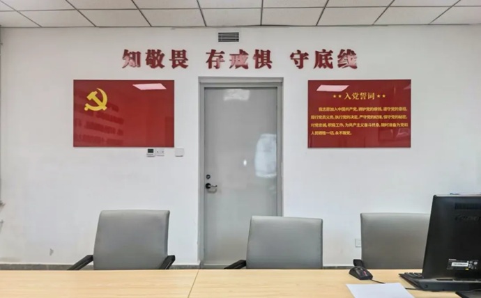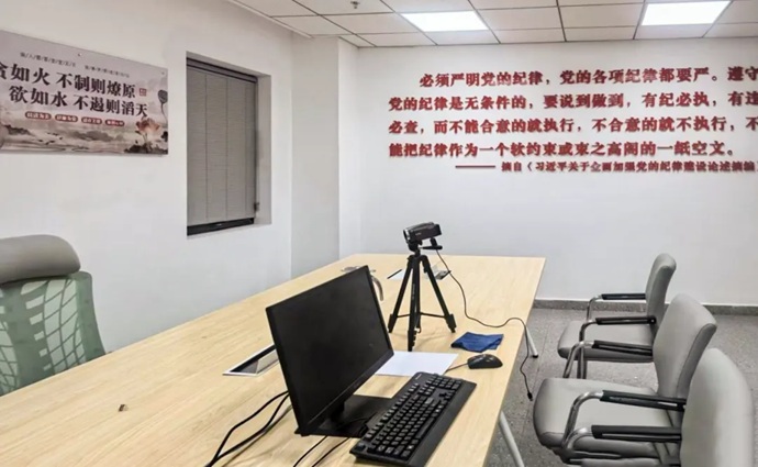 “初心談話室”位于集團(tuán)9樓紀(jì)律檢查部。墻體設(shè)置有黨旗、入黨誓詞,以及習(xí)近平總書記關(guān)于加強(qiáng)黨的紀(jì)律建設(shè)重要論述摘編等內(nèi)容。室內(nèi)還配有專用辦公電腦、打印機(jī)、光盤刻錄機(jī)等設(shè)施設(shè)備,實(shí)行全封閉管理,嚴(yán)格執(zhí)行使用登記制度。