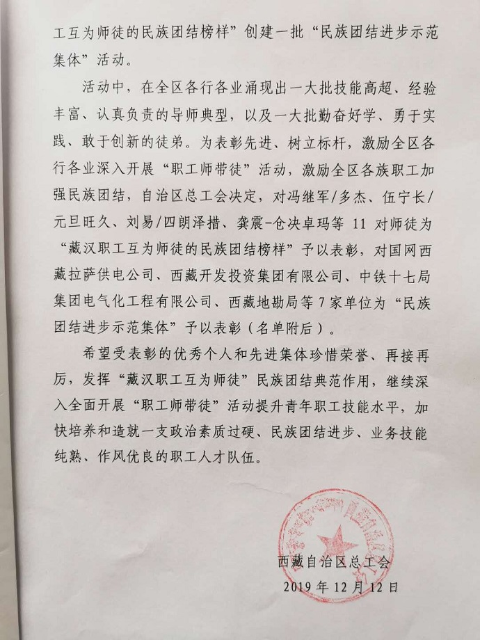 西藏自治區(qū)總工會關于選樹一批"藏漢職工互為師徒的民族團結榜樣"創(chuàng)建一批"民族團結進步示范集體"的表彰決定