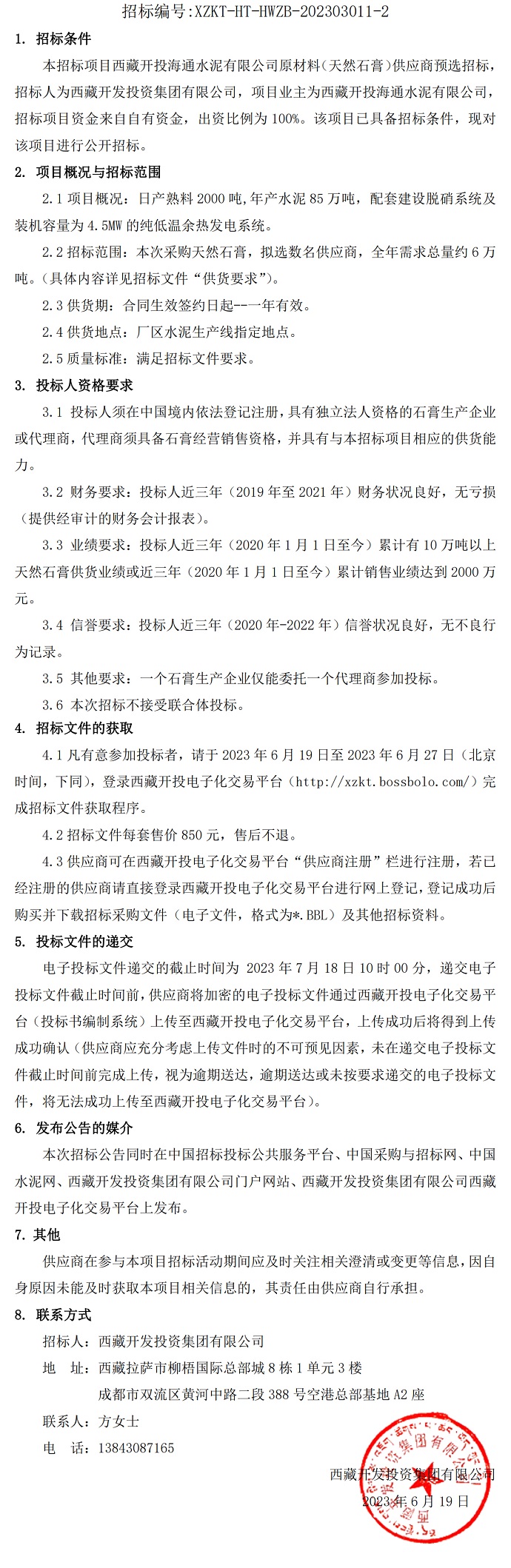 西藏開(kāi)投海通水泥有限公司原材料(天然石膏)供應(yīng)商預(yù)選招標(biāo)公告(二次)