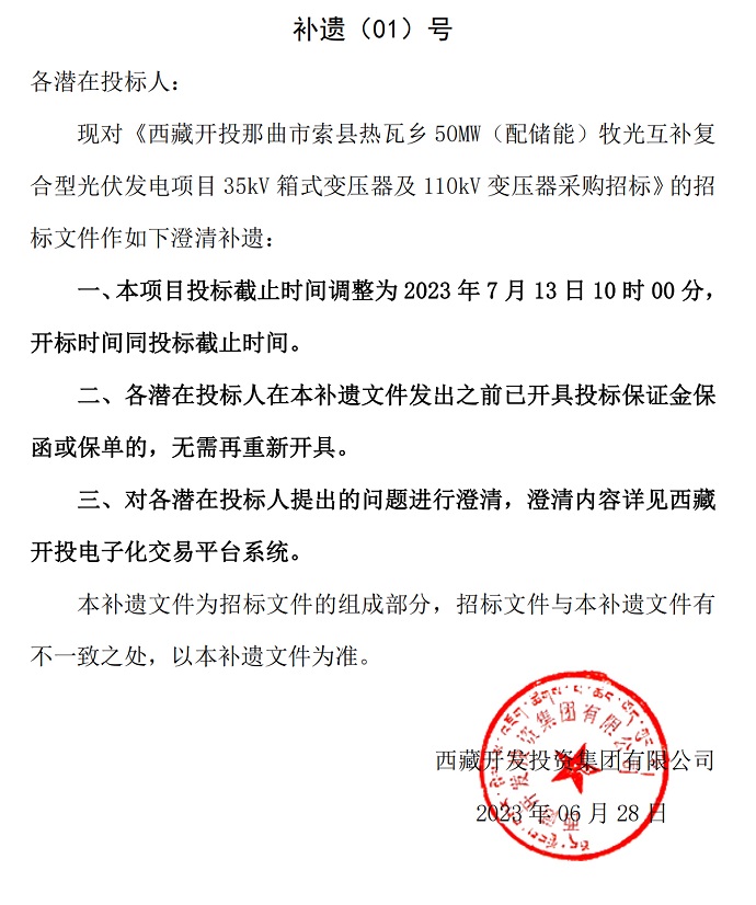 西藏開投那曲市索縣熱瓦鄉(xiāng)50MW(配儲(chǔ)能)牧光互補(bǔ)復(fù)合型光伏發(fā)電項(xiàng)目35kV箱式變壓器及110kV變壓器采購(gòu)招標(biāo)