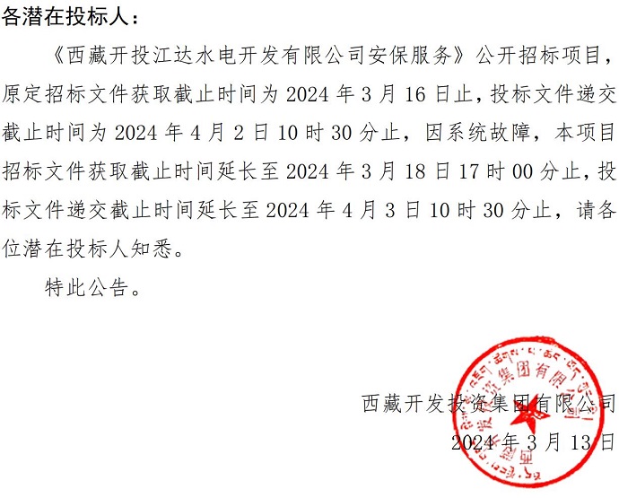 關于延長《西藏開投江達水電開發(fā)有限公司安保服務》招標文件