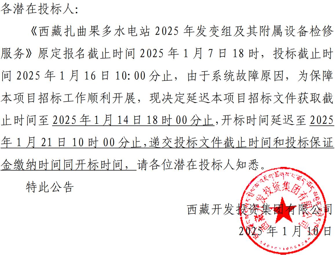 關(guān)于延長《西藏扎曲果多水電站 2025 年發(fā)變組及其附屬設(shè)備檢修服務(wù)》報名及投標(biāo)截止時間的公告