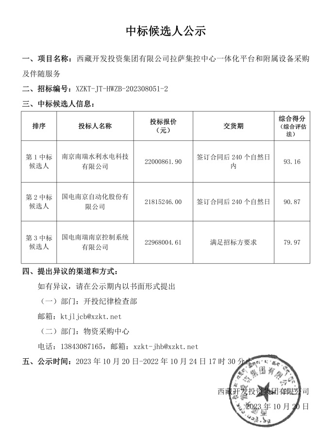 中標(biāo)候選人公示(集控中心一體化平臺(tái)(二次)